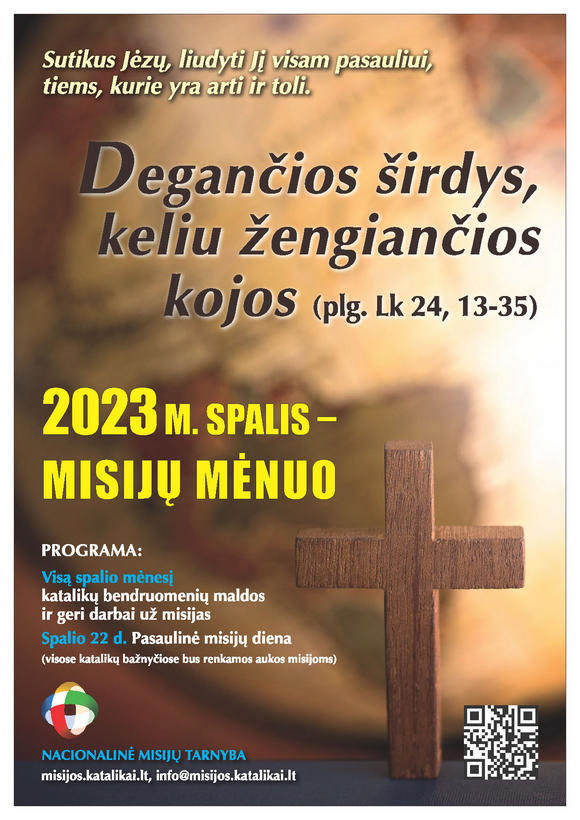Spalį švenčiame ir MISIJŲ mėnesį. 2023 m. Misijų mėnesio tema – „Degančios širdys, keliu žengiančios kojos“ (plg. Lk 24, 13–35). Spalio 22-oji – Misijų sekmadienis.