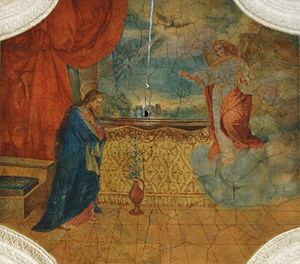Kauno Šventojo Kryžiaus (karmelitų) parapijos nuotraukoje – bažnyčios skliautų freska „Apreiškimas Švč. Mergelei Marijai“. Freskos katechezę kviečiame skaityti karmelituparapija.lt >>