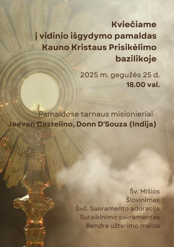 Gegužės 25-ąją, sekmadienio vakarą, Kauno Kristaus Prisikėlimo bazilikoje „Gailestingumo versmės“ bendruomenė kviečia į Vidinio išgydymo pamaldas su misionieriais iš Indijos.
