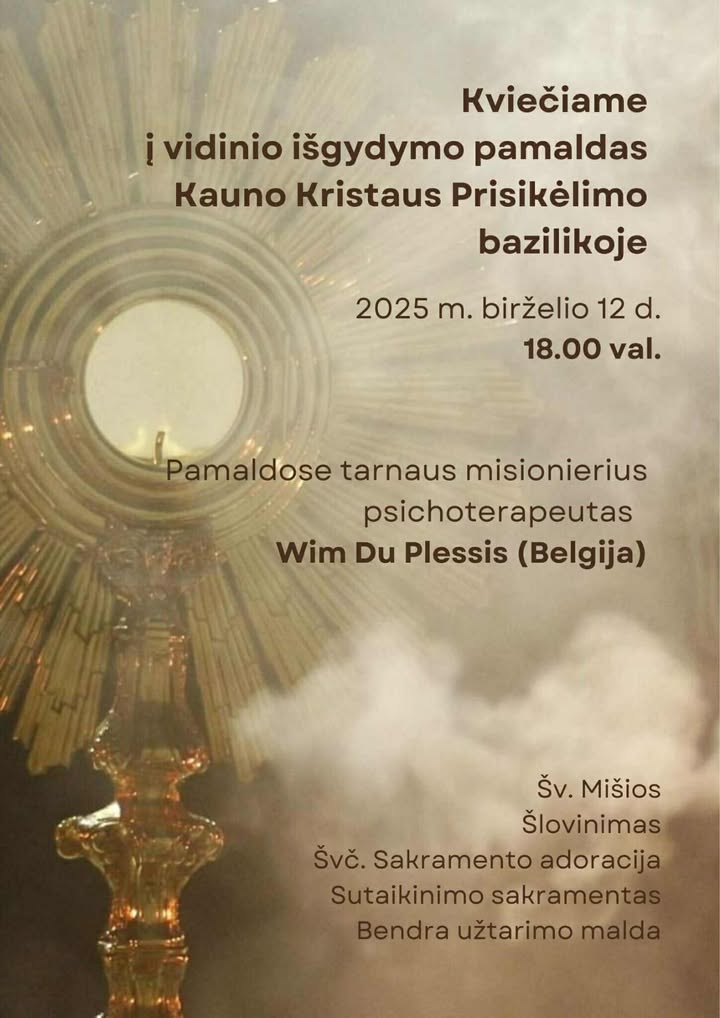 Birželio 12 d. 18 val. bendruomenė „Gailestingumo versmė“ kviečia į Vidinio išgydymo pamaldas Kristaus Prisikėlimo bazilikoje Kaune. Dalyvauja misionierius Wim du Plessis (Belgija).