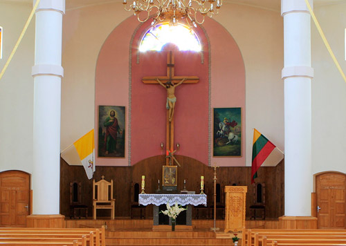 Apvalaus plano bažnyčią su grakščiu bokštu puošia didysis Šv. Jurgio altorius. Per pamaldas grojama Olandijoje pagamintais vargonais.
