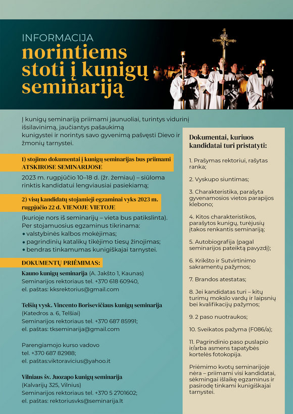 Skelbiama informacija jaunuoliams, jaučiantiems pašaukimą ir norintiems stoti į kunigų seminariją. Dokumentai bus priimami rugpjūčio 10–18 d. Kauno, Telšių, Vilniaus seminarijose.