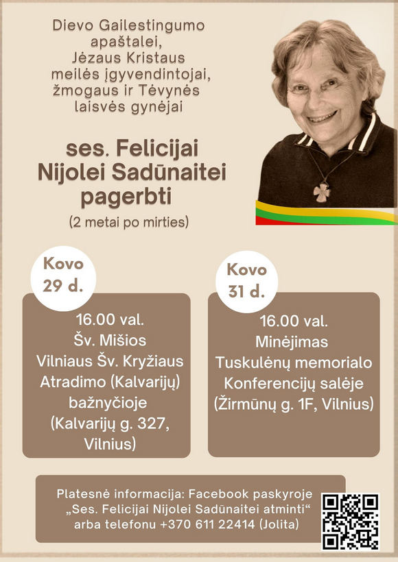 Kovo 31 d. (antradienį), ses. Nijolės iškeliavimo pas Viešpatį dieną, 16 val. vyks pagerbimo renginys Tuskulėnų memorialo Konferencijų salėje (Žirmūnų g. 1F, Vilniuje).