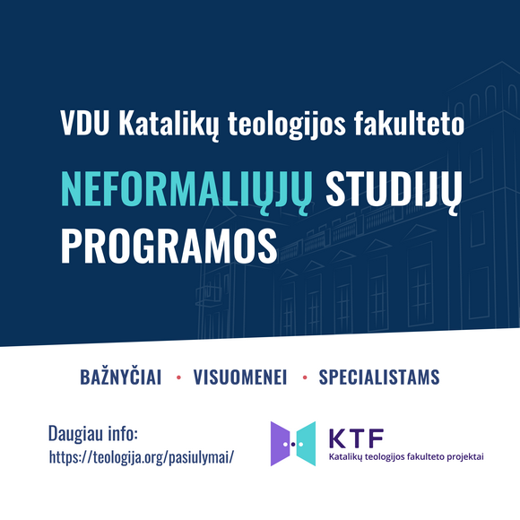 VDU Katalikų teologijos fakultetas kviečia į neformaliųjų studijų programas. Šios studijos skirtos visiems, norintiems pagilinti savo tikėjimo žinias, geriau suprasti šiandienius socialinius ir politinius procesus, pritaikyti įgytas žinias bei įgūdžius profesiniame bei dvasiniame gyvenime.