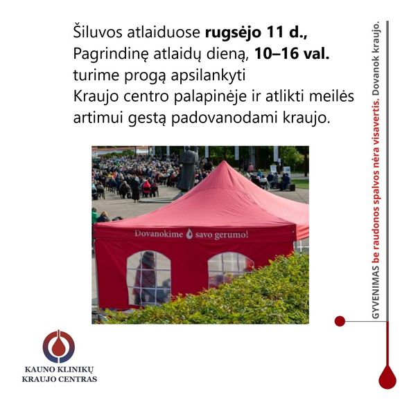 Švenčiant atlaidus rugsėjo 11 d., sekmadienį, Kauno klinikų Kraujo centro palapinėje (greta Šiluvos aikštės) galimybė atlikti praktinį meilės darbą – dalyvauti kraujo donorystės akcijoje.