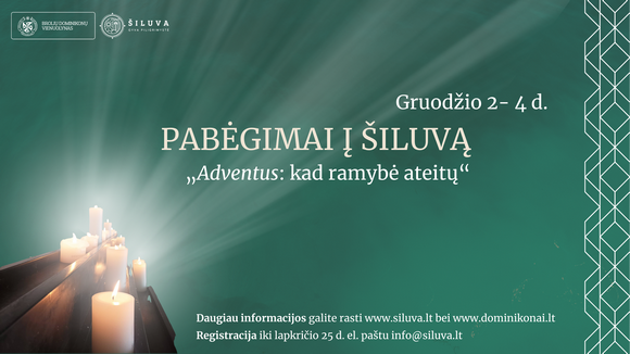 Šiluvos piligrimų centras drauge su Vilniaus dominikonais kviečia vieną gruodžio savaitgalį pabėgti į Šiluvą tam, kad ramybė ateitų. Nuo gruodžio 2 iki 4 d. jūsų lauks prasminga dovana artimui, Kalėdaičių sau ir artimiesiems gaminimas, paskaitos ir susitikimai su arkivyskupu Lionginu Virbalu SJ, Šiluvos parapijos klebonu kunigu Erastu Murausku, broliu dominikonu tėvu Mindaugu Slapšinsku, kunigu Robertu Urbonavičiumi, sesėmis eucharistietėmis – jie visi susiburia tam, jog kiekvienam dalyvaujančiam rastų laiko.