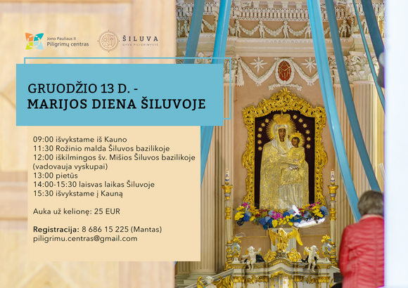 Jono Pauliaus II piligrimų centras kviečia drauge keliauti į Mergelės Marijos šventovę - Šiluvą - jau ateinantį antradienį, gruodžio 13 dieną. Advento laikotarpyje esame kviečiami atverti savo širdis ypatingam slėpiniui - Jėzaus Gimimui. Kas gali labiau padėti paruošti širdis mūsų Išganytojo gimimui, jei ne Marija!