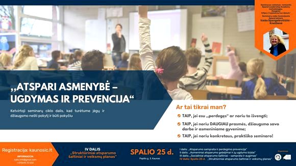 Kauno arkivyskupijos Katechetikos centras tikybos mokytojus ir visus ugdytojus kviečia į seminarų ciklo „Atspari asmenybė – ugdymas ir prevencija“ IV dalį.