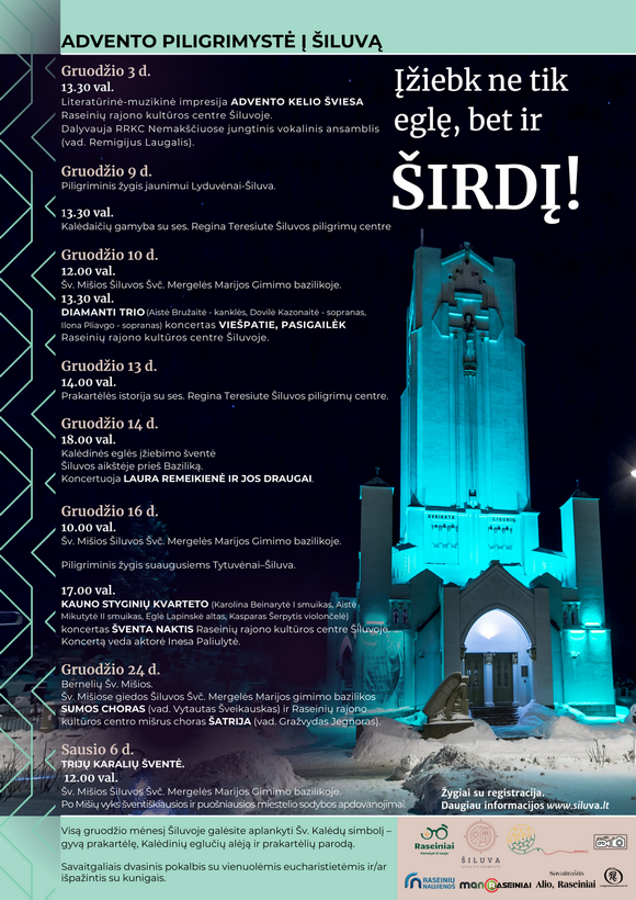 Drauge susivienijusios organizacijos – VšĮ Šiluvos piligrimų centras, Šiluvos parapija, Raseinių rajono savivaldybė, Šiluvos seniūnija, Raseinių rajono kultūros centras, vietos bendruomenė – kviečia atkeliauti į ADVENTO miestelį ŠILUVOJE, kuriame lauks ne tik eglė, gyva prakartėlė, prakartėlių paroda, Advento vainiko pynimas, savaitgalio piligrimystės, Kalėdų senelio dirbtuvės, vietinių gyventojų gaminta produkcija, tačiau ir laikas, skirtas kiekvienam atvykusiam asmeniškai.