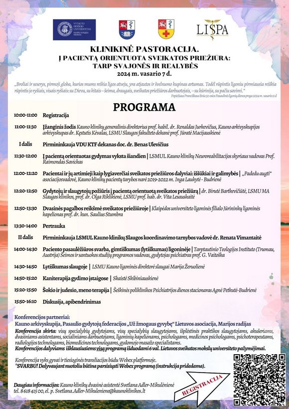 Vasario 7 d. kviečiame dalyvauti Lietuvos sveikatos mokslų universiteto mokslinėje-praktinėje konferencijoje „KLINIKINĖ PASTORACIJA. Į PACIENTĄ ORIENTUOTA SVEIKATOS PRIEŽIŪRA: TARP SVAJONĖS IR REALYBĖS“. Konferencijos partneriai – Kauno arkivyskupija, Pasaulio gydytojų federacijos „Už gyvybę“ Lietuvos asociacija, „Marijos radijas“.