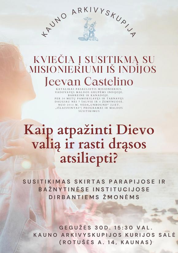 Gegužės 30 d., ketvirtadienį, 15.30 val. Kauno arkivyskupijos kurijoje parapijų bei institucijų bendradarbiai kviečiami į susitikimą su misionieriumi iš Indijos JEEVAN CASTELINO pasigilinti, kaip atpažinti Dievo valią ir rasti drąsos į ją atsiliepti.