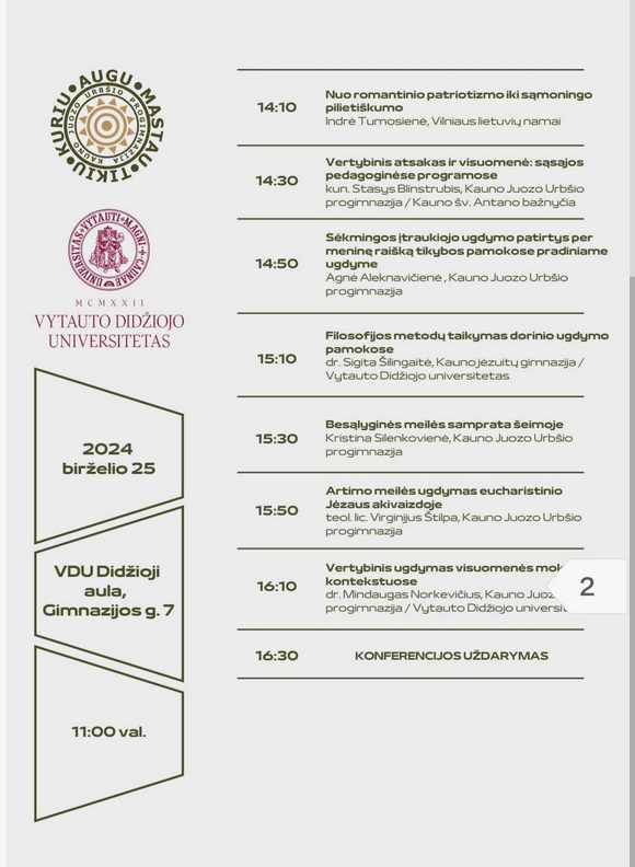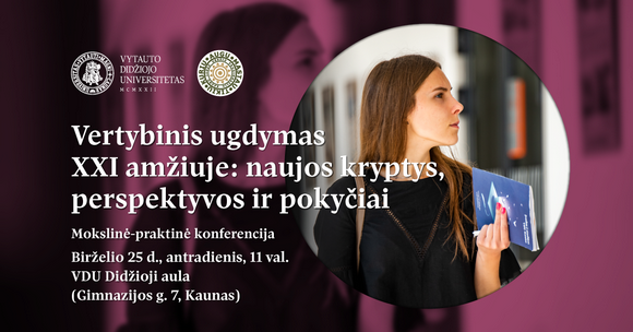 Birželio 25 d. 11 val. Vytauto Didžiojo universiteto Didžiojoje Auloje (Gimnazijos g. 7) vyks mokslinė-praktinė konferencija „Vertybinis ugdymas XXI amžiuje: naujos kryptys, perspektyvos ir pokyčiai“ (nemokama).