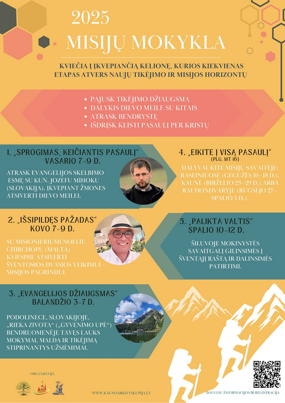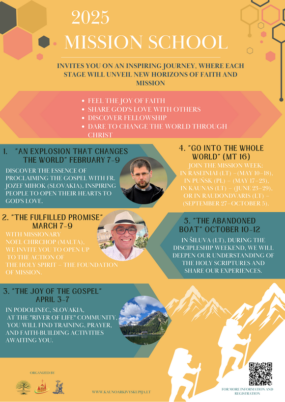 Ar jauti, kad širdyje slypi pašaukimas į kažką didesnio? Gal metas atsistoti, pakilti ir drąsiai atsakyti į šį kvietimą? Misijų mokykla 2025 laukia Tavęs – gal tai Tavo galimybė keisti pasaulį, pradedant nuo savęs! Šiais metais Misijų mokykla kviečia į dar stipresnę, įkvepiančią kelionę, kurios kiekvienas etapas atvers naujų tikėjimo ir misijos horizontų.