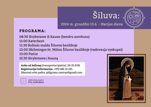 Gruodžio 13 dieną, penktadienį, artėjant šv. Kalėdoms, Jono Pauliaus piligrimų centras kviečia tradiciškai drauge keliauti Šiluvą ir švęsti Marijos dieną!