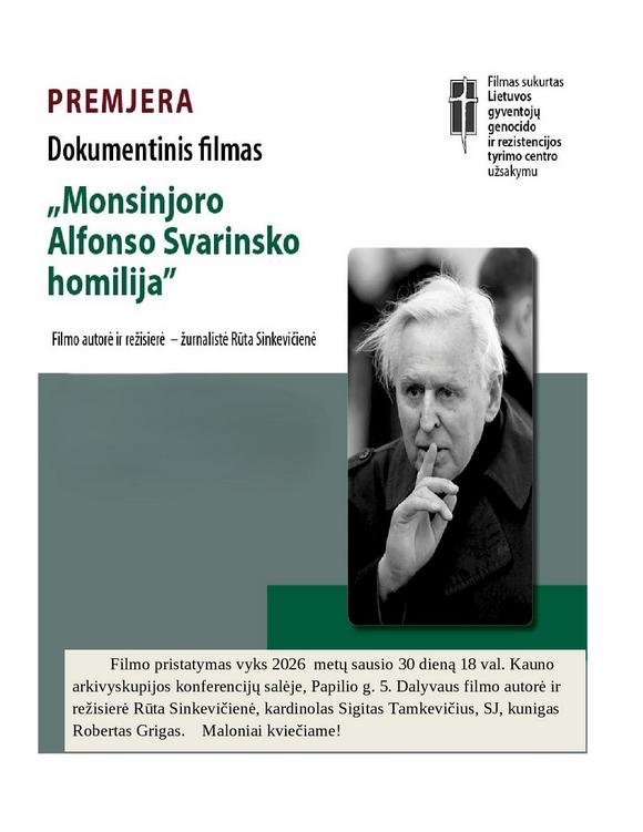 Sausio 30 d. dokumentinio filmo „Monsinjoro Alfonso Svarinsko homilija“ pristatymas Kaune