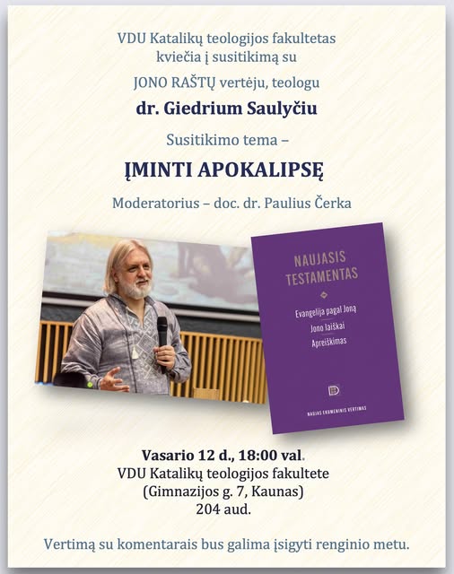 Vasario 12 d. 18 val. VDU Katalikų teologijos fakultetas kviečia į Lietuvos Biblijos draugijos išleistų šv. apaštalo Jono raštų ekumeninio vertimo pristatymą. Susitikime – vertėjas, teologas dr. Giedrius Saulytis.