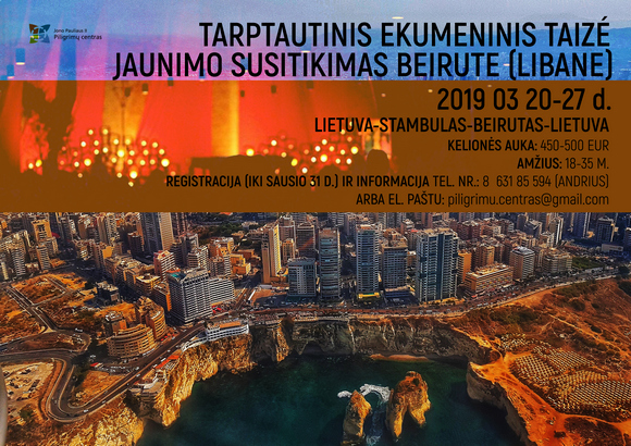 Kur? – Artimųjų Rytų Taizé susitikimas Libane, Beirute. Misija – melstis kartu su Artimųjų Rytų krikščionimis už juos ir jų kraštą. Parodyti, jog girdime apie jų sunkumus ir jie mums rūpi. Planuojama kelionės data – 2019 m. kovo 20–27 d.