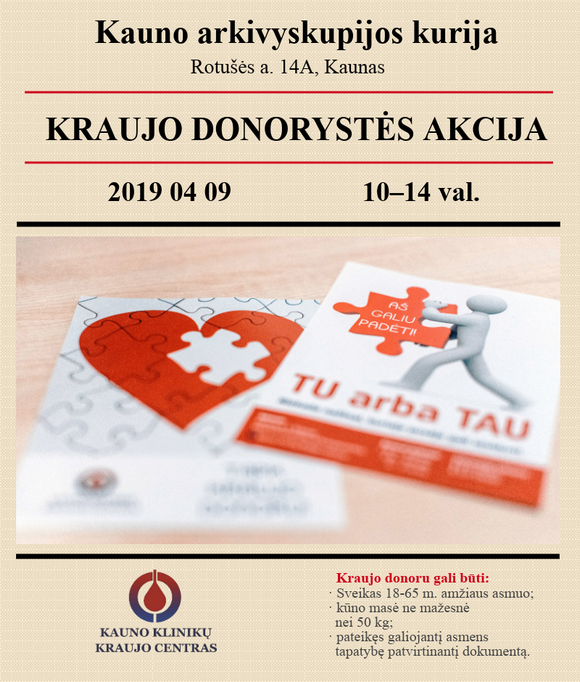 Kauno arkivyskupijos kurija ir Kauno klinikų kraujo centras kviečia Jus prisidėti prie pagalbos tiems, kuriems gyvybiškai reikia kraujo, ir organizuoja DONORYSTĖS AKCIJĄ.