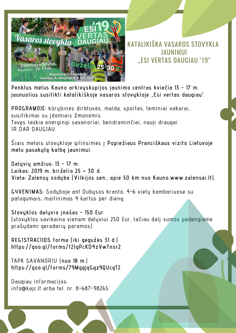 Šiais metais stovykloje gilinsimės į Popiežiaus Pranciškaus vizito Lietuvoje metu pasakytą kalbą jaunimui.