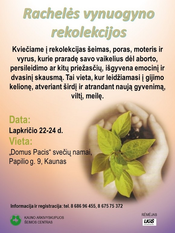 Kviečiame į rekolekcijas moteris / šeimas, praradusias savo kūdikius dėl aborto, persileidimo ar kitų priežasčių. Rekolekcijos vyks lapkričio 22–24 d. Domus Pacis namuose piligrimams. Informacija ir registracija mob. 8 686 96455, 8 675 75372.