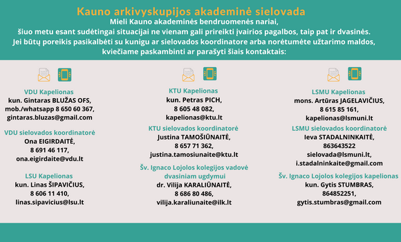 Kauno aukštosiose mokyklose tarnaujantys kunigai kapelionai bei kiti akademinės sielovados bendradarbiai >> yra pasirengę ir šiuo karantino metu teikti dvasinę pagalbą savo bendruomenių nariams. Jos prireikus kviečiame kreiptis nurodomais kontaktais.