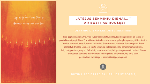 Nuo gegužės 22 iki 30 d. visi, kurie užsiregistruosime, kasdien gausime el. laišką ir pasitelkdami popiežiaus Pranciškaus katechezes turėsime galimybę apmąstyti Šventosios Dvasios mums siųstas dovanas, prisiminti šventuosius, kurie tas dovanas praktikavo, apmąstyti trumpą Šventojo Rašto ištrauką, keletą klausimų asmeniniam augimui.