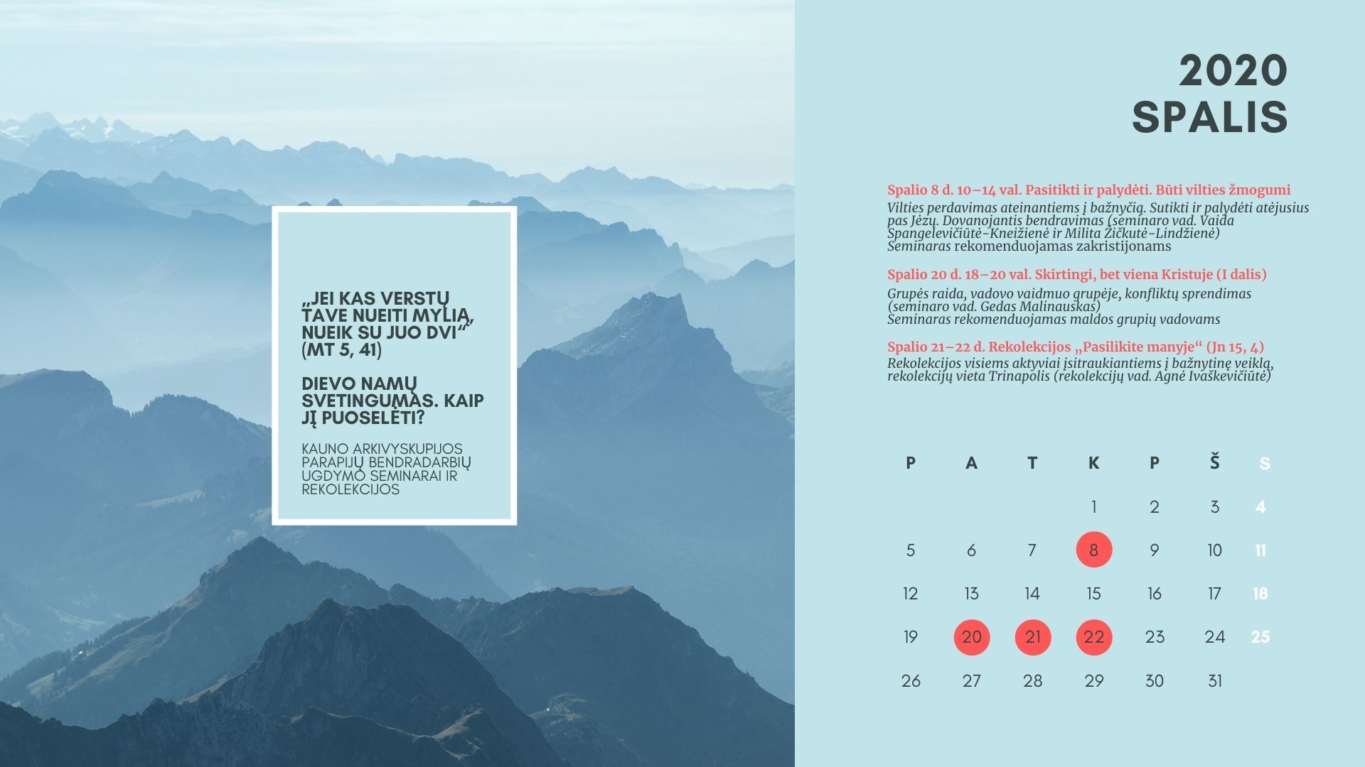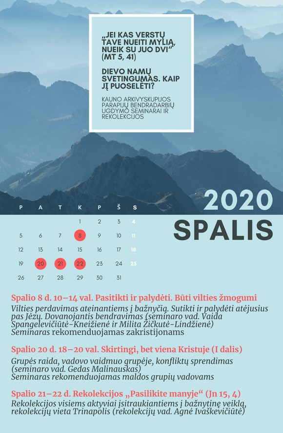 Seminarų ciklą užbaigs spalio 21–22 d. rekolekcijos Vilniuje, Trinapolio rekolekcijų namuose. Rekolekcijas ves Agnė Ivaškevičiūtė. Į rekolekcijas kviečiami sielovados bendradarbiai parapijose bei bažnytinėse institucijose.
