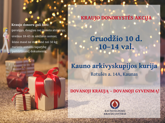 Viena iš Advento dovanų artimui gali būti įsitraukimas į gruodžio 10 d. Kauno arkivyskupijos kurijoje vyksiančią KRAUJO DONORYSTĖS AKCIJĄ. Kviečiami institucijų ir kitų bažnytinių organizacijų darbuotojai, jų šeimos, savanoriai.