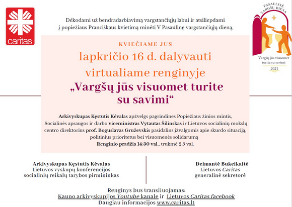 Lapkričio 16 d. Lietuvos CARITAS organizuoja virtualų renginį „Vargšų jūs visuomet turite su savimi“.