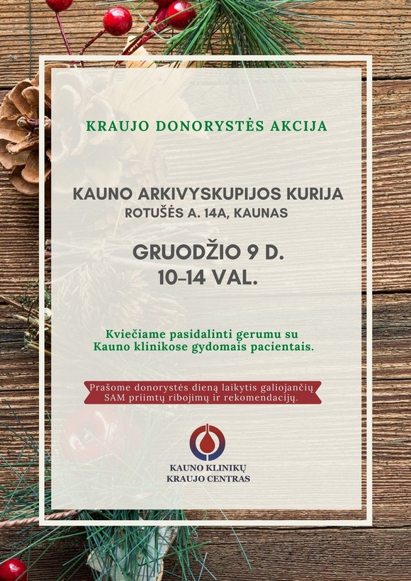 Gruodžio 9 d., ketvirtadienį, (!) galime prisidėti prie vienos kilniausių savanorystės veiklų – Kraujo donorystės akcijos, kuri organizuojama Kauno arkivyskupijos kurijoje.