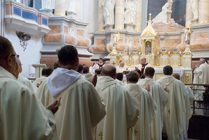 Rudeniškai vaiskią spalio 11-ąją 11 val. pro didžiąsias šventovės duris prie didžiojo altoriaus arkikatedroje atėjo gausi, per 80-ties arkivyskupijoje, jos parapijose, institucijose tarnaujančių kunigų, taip pat Kauno kunigų seminarijos klierikų procesija, kuriai vadovavo Kauno arkivyskupas metropolitas Sigitas Tamkevičius. Arkikatedroje, kad ir paprastą savaitės dieną, buvo gausu tikinčiųjų, daug jaunų žmonių, seserų vienuolių, bažnytinių institucijų, organizacijų darbuotojų.