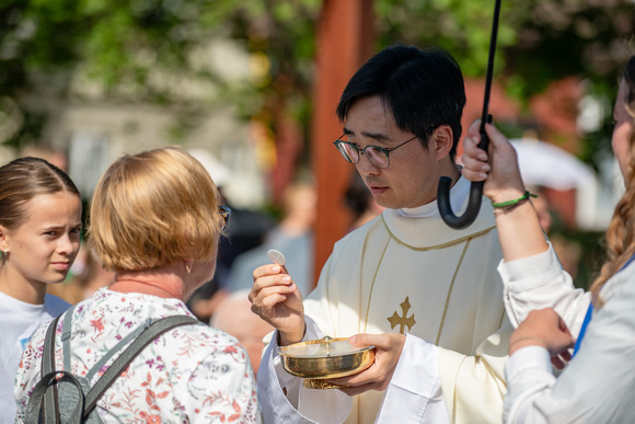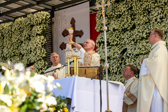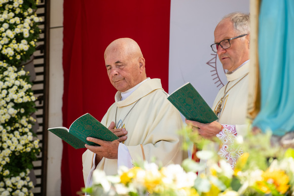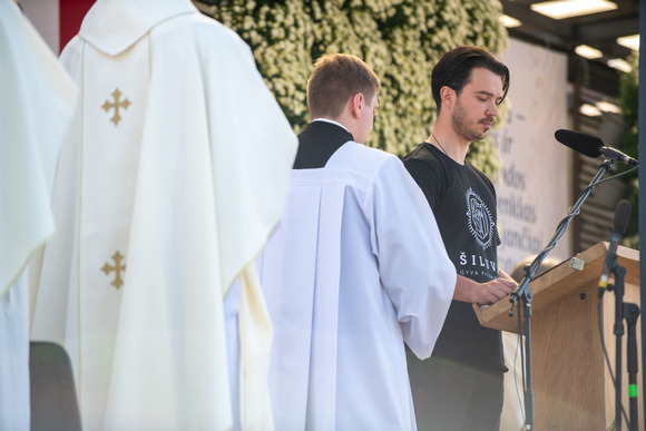 Iškilmingoje Eucharistijoje melsta Bažnyčios vienybės ir Šventosios Dvasios vedimo, o liturgijai vadovavo ir homiliją pasakė apaštalinis nuncijus arkivyskupas A. P. Rajičius, Šiluvoje kasmet pasveikinantis Lietuvos tikinčiuosius.