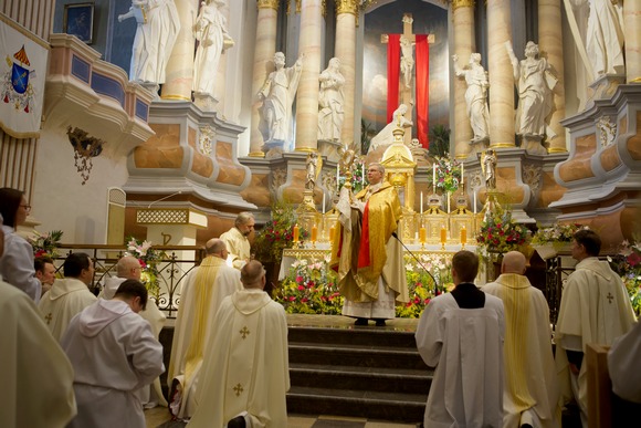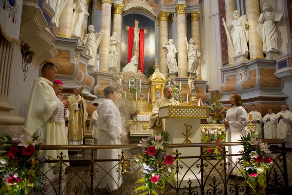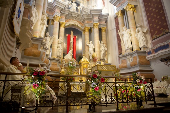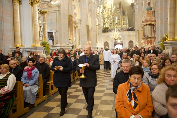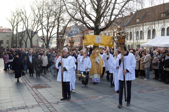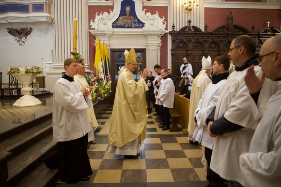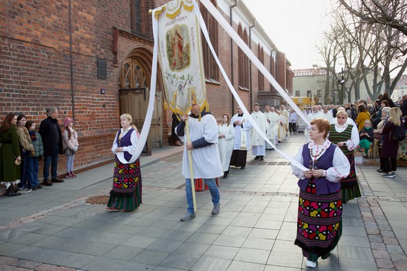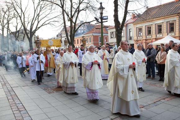 Velykų sekmadienio Mišios ankstyvą rytmetį ir Kauno arkikatedroje prasidėjo pagal labai seną, bet Lietuvoje nenutrūkstančią tradiciją einama procesija su Švenčiausiuoju Sakramentu aplink šventovę tris kartus.