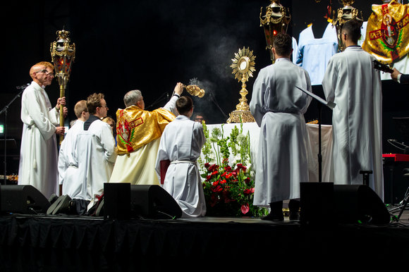 Jungtinės tarptautinės Lietuvos, Slovakijos, Anglijos šlovinimo pajėgos, vadovaujamos tėvo redemptoristo Rastislavo Dluhý, visus halėje netrukus pakėlė iš vietų. Ar jaunam, ar vyresniam – visiems vėrėsi burnos, aukštyn kilo rankos šlovinti Viešpatį. Ir linko keliai Švenčiausiojo Sakramento adoracijai. Viešpats buvo galingai pašlovintas ir pagarbintas Jubiliejaus metų vilties mieste!