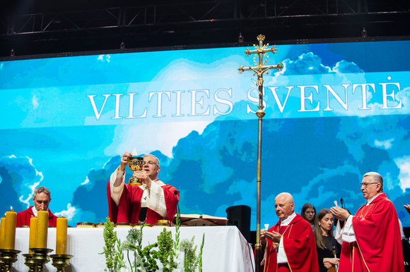 „Drįskite būti vilties žmonėmis! Būkime Jo vilties švyturiais mūsų broliams ir seserims, mūsų miestams ir mūsų Tėvynei. Švieskime ta nuostabia dovana, kuri spindi mumyse dangaus džiaugsmu“, – sakė arkivyskupas Kęstutis Kėvalas, vakarop halėje su LIetuvos vyskupais švenčiant Eucharistiją.