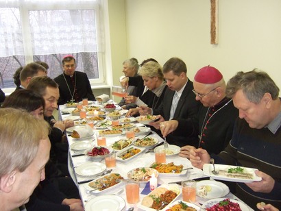 Arkivyskupas palaimino Kūčių stalą, drauge su savo pagalbininku vysk. Kęstučiu padalijo kalėdaičius, palinkėjo šventinio džiaugsmo, ramybės parnešti į savo aplinką, savo artimiesiems. Žodį taręs miesto meras linkėjo, kad ateinančiais metais visų gyvenime būtų daugiau šviesos, grožio, tarpusavio draugiškumo.