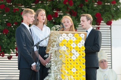 Visai netrukus, po katechezės, Dievo Motinos litanijos invokacijos iš jaunų širdžių pasklido aikštėje – jas giedojo jungtinis Vitos Liaudanskaitės-Vaitkevičienės vadovaujamas šių iškilmių choras, susidedantis net iš kelių kolektyvų: tai VDU KTF choras „Veritas“, mišrus jaunimo choras „Exaudi“, Vilniaus Dievo Gailestingumo, Pal. Jurgio Matulaičio, Šventojo Kryžiaus Atradimo (Kalvarijų) parapijų chorai bei pučiamųjų instrumentų kvintetas „Brass Bravo“ (vad. Andrius Dirmauskas), vargonavo Dalia Jatautaitė.