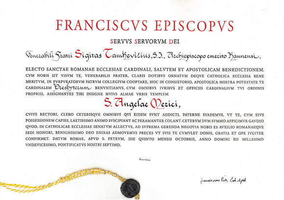 SIUNČIA SVEIKINIMĄ IR APAŠTALINĮ PALAIMINIMĄ. KADANGI MUMS ATRODĖ TINKAMA TAVE, GARBINGASIS BROLI, APDOVANOTĄ RYŠKIOMIS PRIGIMTINĖMIS DOVANOMIS IR DIDŽIAI NUSIPELNIUSĮ KATALIKŲ BAŽNYČIAI, IŠRINKTI Į TĖVŲ KARDINOLŲ KOLEGIJĄ, ŠIOJE KONSISTORIJOJE SAVO APAŠTALINE GALIA SKELBIAME TAVE KARDINOLU KUNIGU SU VISOMIS TAVO LUOMO KARDINOLAMS PRIKLAUSANČIOMIS TEISĖMIS BEI PAREIGOMIS, PASKIRDAMI TAU ĮSTABIĄ ŠIO MAITINANČIO MIESTO