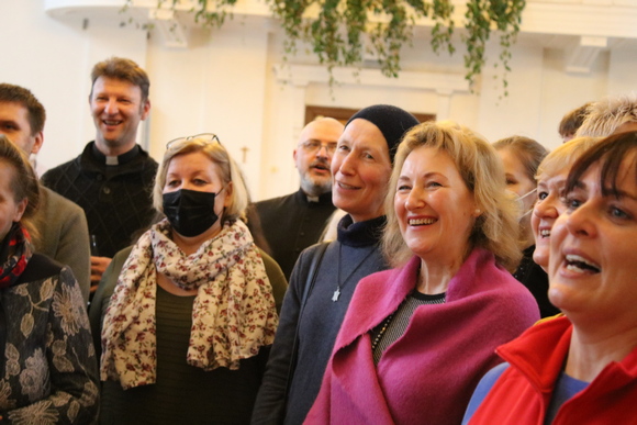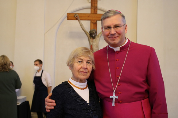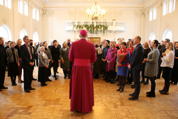 Bendrystės džiaugsmas su sugiedotu „Ilgiausių metų“ ganytojui vėliau tęsėsi arkivyskupijos salėje.