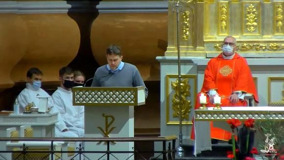 Prieš vakaro šv. Mišias ugdytojų intencijomis melstasi Švenčiausiojo Sakramento adoracijos valandėlę, o vėliau Eucharistijai vadovavo kunigas Artūras Kazlauskas, pakviesdamas dar melstis už abiturientus, kurie dabar švenčia šimtadienius prieš intensyvaus pasirengimo baigiamiesiems egzaminams laiką, taip melstis už krikščionišką liudijimą tądien minėto švento vyskupo Polikarpo pavyzdžiu ir, žinoma, už Ukrainos žmones, kurie vis dėlto po šios dienos vakaro vasario 24-osios rytmetį sulaukė karinės atakos savo šalyje.