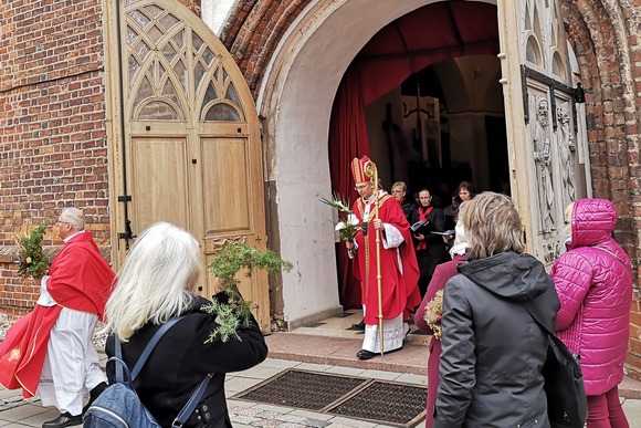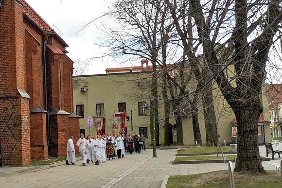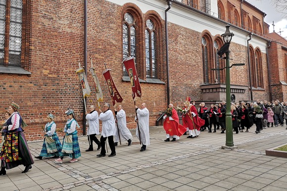 Diakonui Dariui Chmieliauskui paskelbus Evangelijos žinią pagal Luką apie Jėzaus įžengimą į savo miestą Jeruzalę, kur paskui turėjo kentėti, mirti ir prisikelti, panašiai kaip toji tada Jėzų sveikinusi minia dvasininkai ir tikintieji išėjo į procesiją paskui Kryžių aplink arkikatedrą su palaimintomis verbų šakomis. Arkikatedros choras, vadovaujamas Mindaugo Šikšniaus, savo giesme atkartojo tada minios Jėzui šauktą „Osana!“