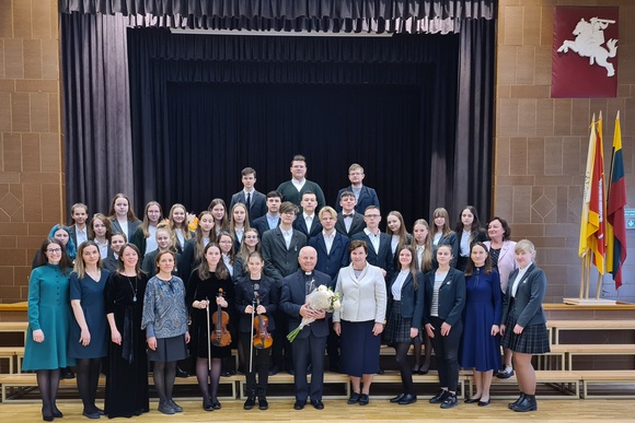 Sveikindami kardinolą su kunigystės jubiliejumi, dovanojome muzikinę dovaną. Gimnazijos mišrusis choras „Vyturys" sudainavo Juozo Naujalio dainą Maironio žodžiais „Už Raseinių, ant Dubysos“.
