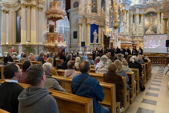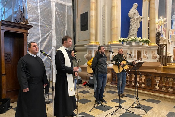 Sugiedojus dabar visų širdis veriantį Ukrainos himną, arkikatedroje buvo paskelbta Evangelija pagal Joną, tik šį kartą, per šią Misijų savaitę, ji nuskambėjo neįprastai – papasakojant Jėzaus istoriją nuo pat gimimo iki pat dangun žengimo giesmėmis, Šventojo Rašto tekstu ir filmo epizodais.