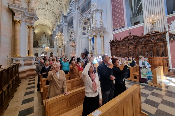 Liturgijos dalyviai misionierių kvietimu po homilijos atliko tikėjimo atnaujinimo ženklą – iškėlę rankose Mišių pradžioje pašventintus kryželius atnaujino Krikšto pažadus.
