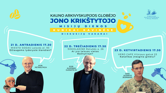 Visiems atviri susitikimai-diskusijos su dvasininkais – kunigu Petru Pichu, tėvu Aldonu Gudaičiu SJ bei diakonu Andriumi Jesinsku „karštomis“ temomis (lyderystė, katalikas ir... ginklai, ir ...laisvos vietos (?!) Bažnyčioje) antradienį (06 21 d.), trečiadienį (06 22 d.) ir ketvirtadienį (06 23 d.) 17.30 val. vyks miesto kavinėse „Miesto sodas“ (Laisvės alėjoje), „Šokoladinė“ (Rotušės aikštėje) bei „Vero Cafe“ (Vilniaus gatvėje).