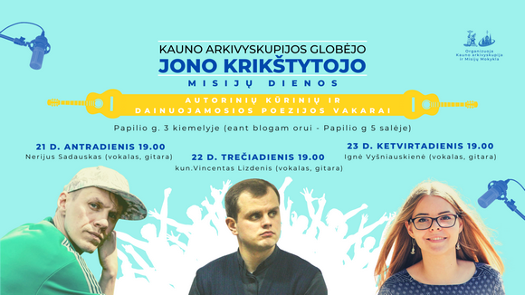 Paskui kviečiame užsukti į arkivyskupijos kiemelį Papilio g. 3 (greta Santakos), kuris šiais birželio vakarais 19 val. suskambės muzikos garsais – šiemet čia vyks autorinės kūrybos bei dainuojamosios poezijos vakarai su muzikiniais talentais apdovanotais kūrėjais bei atlikėjais – mūsų bendruomenės žmonėmis. (Esant blogam orui, vyks greta esančioje salėje, Papilio g. 5).