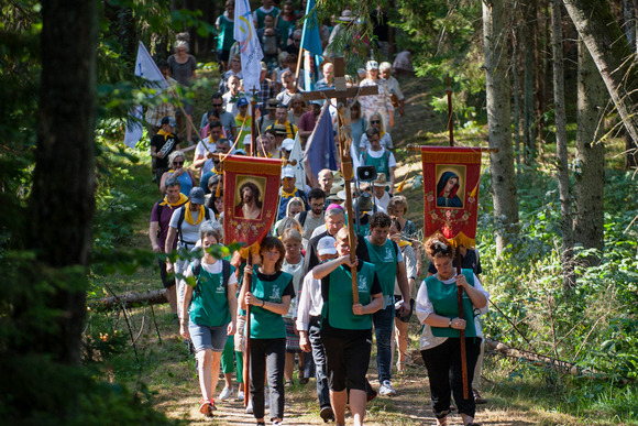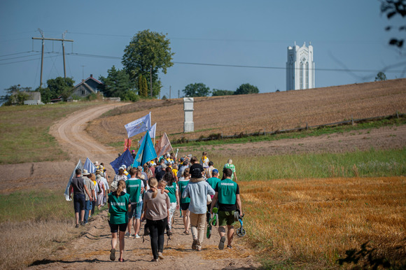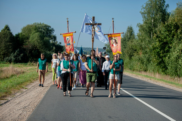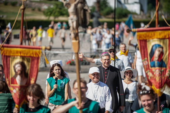 Su Jono Pauliaus II piligrimų centro jaunaisiais savanoriais bei kitais Kauno arkivyskupijos piligrimais eisenoje keliavo krikščioniško sutuoktinių judėjimo – Dievo Motinos komandų – šeimos, praleidusios rekolekcijų savaitgalį Šiluvoje.