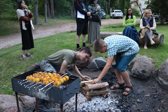 Mokymai tęsėsi iki vėlaus vakaro, o po vakarienės visi susirinko prie laužo, kurį su džiaugsmu sukrovė ir kurstė dalyvių vaikai. Čia vyko diskusijos, skambėjo dainos, o kukurūzų kepimas, gaivus pušyno kvapas ir laužo šviesa leido pajusti tikrą stovyklos atmosferą.