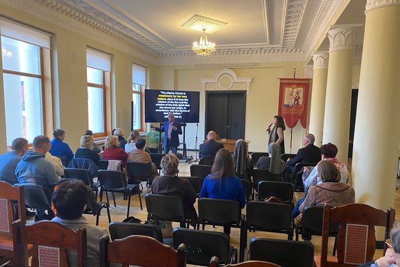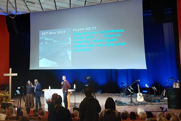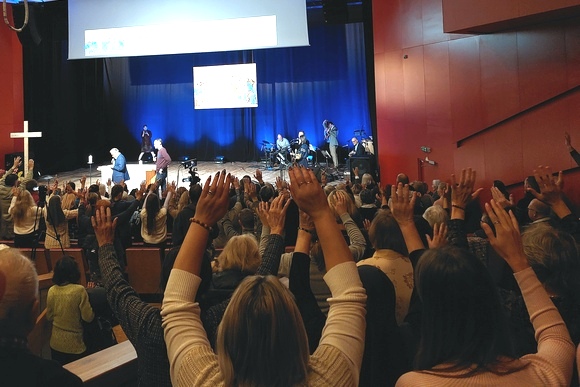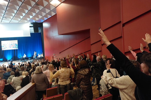 Misionierius vis ragino žmones salėje kuo garsiau ir karščiau šlovinti, pabrėždamas, kaip dūžta tikėjimo abejonės, kai giedame, meldžiamės... „Auginkite savo tikėjimą šlovindami Dievą!“