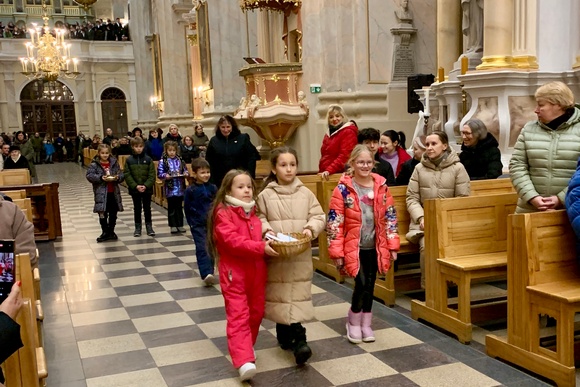 Šv. Mišiose meldėmės už Carito humanitarinės pagalbos programą bei visus karitatyvinės misijos bendradarbius, savanorius, aukotojus, geradarius, pagalbą gaunančius žmones. Mišių atnašas – duoną, vyną ir savo rašytus laiškus, maldavimus Dievui – atnešė vaikai iš Ukrainos.